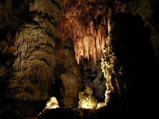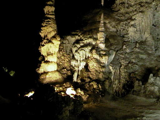 is total darkness, but there is dramatic lighting to show the stalactites,